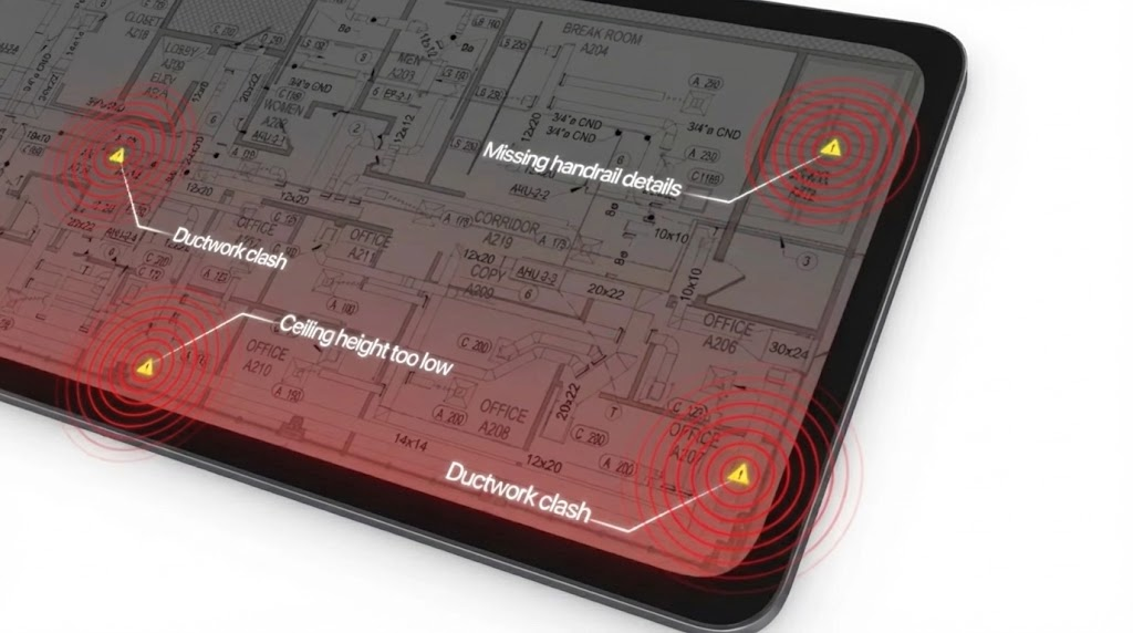 Custom AI models cross-check every page of your drawings for issues.